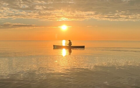In the summer of 2023, Ed and I paddled our canoes out to Lake Michigan from the Platte River as the sun was setting. To the east over the land a clear blue sky trailed edges of pink. To the west over the water the horizon was molten gold. Ed snapped a picture of my canoe silhouetted against all that wondrous light.