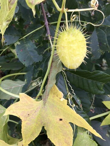 This September, I saw a spiny green fruit hanging from a vine that had five-lobed leaves and curly tendrils. "What the heck is that?" I asked Ed. He shrugged.