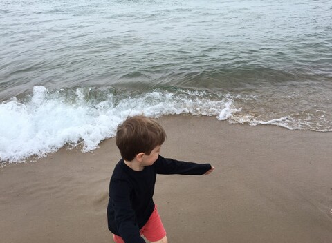 When we got to the beach, Emmett went straight for the water. While he was throwing stones into the surf, a wave surged up, slapping him in the chest and legs. The look on his face was priceless.
